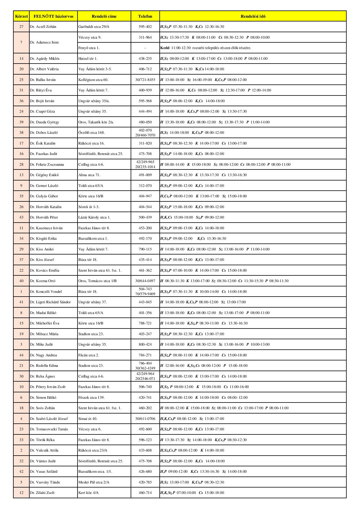 HÁZI FELNŐTTORVOSI KÖRZETEK